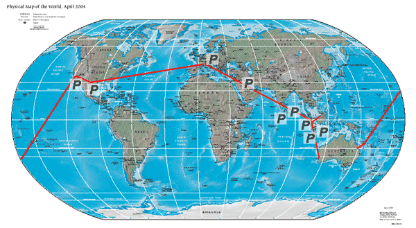This is a map of our trip back from Australia, flying around the world from Perth Australia, to Malaysia, making a detour to Sri Lanka, to Dubai, United Arab Emirates, Munich Germany, to Houston, Texas and back to San Diego...
