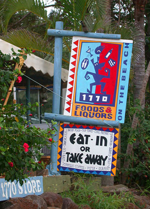 We drove into Agnes Water, four miles short of our destination of 1770. The two-lane blacktop road wound around through the town towards the seashore, passing a shopping center with an IGA supermarket, a gas station, and a surf shop, and a restaurant with a sign saying that it would open in the evening.