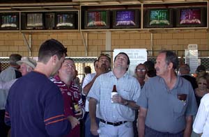 Neal, our diesel mechanic passed by. “Come over to the VIP tent,” he motioned to the canopy erected over the grass alongside the stands. “Help yourself to beer or wine and goodies.” We followed him over and sampled a few crackers topped with cheese spread.