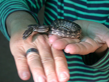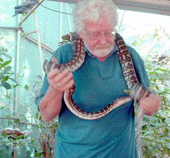 Next the keeper passed around a python—no kidding! First a large one, then a baby. A python does not have a dangerous bite. It kills by wrapping around and squeezing. So if you don’t squeeze it, and handle it loosely, it will just wind around. Even so, I did not feel very comfortable with the big one. Gunter took a video of me with it.