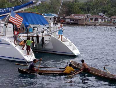 My most precious memories of Kalabahi will be all the children who visited me on Pacific Bliss. They reappeared around 0830, two dugout canoe loads¾about seven or eight of them. Since Gunter and Alison were still on board, I let the children up into the cockpit. Yesterday, alone on Pacific Bliss, I kept three canoes full of children at bay, on the swim steps, afraid that I would not be able to control them all if they entered the boat proper.