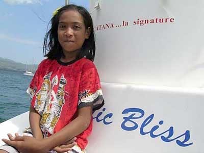 After the delegations have marched onto the field, and the long speeches are over, the most interesting part of the day begins. A carnival atmosphere takes over as teachers and students, dancers and musicians, intermingle with each other and the festival-goers along the dusty road leading back to the town. There are numerous opportunities to talk. And everyone I approach seems eager to pose for me. How they giggle and point as they see the images on the back of my Nikon! The children who rowed out to Pacific Bliss find me among the throng, and from then on, they never leave my side. We stay in town for the first time, having dinner on shore. I try to order a dish of plain rice, and for some reason, have a difficult time making my wishes known. The other cruisers in our group have all finished their more complex meals before mine arrives! Go figure.