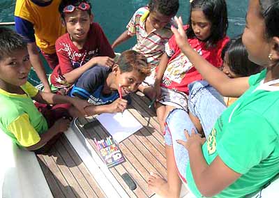 I had quite the TO DO list on Friday, and did not even stop for a nap. My day began with boat frau work: washing the floors, shaking rugs, cleaning heads, cleaning and organizing the fridge. Then a cold shower in my starboard side for a change; that felt so-o good. By that time, my “little kids” arrived and I set them at the table, offering the rest of our banana bread and ginger ale. I showed them where we live (from the placements and photos on board), then gave the boys and girls each a large postcard of Pacific Beach, California to take with them. These children have been the highlight of my Kalabahi experience. I will never forget their smiling faces and deep brown eyes, glowing with the thrill of being on board a yacht.