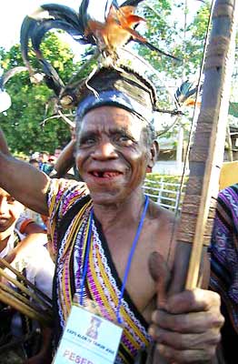 Oh, well. Sometimes the cruising life is just waiting around to see what might happen. I pull out my Lonely Planet, Indonesia to read up on Alor: It is a rugged island, 100 km long and 35 km at its widest. Because of the high rugged mountains, its people have become isolated from each other until fairly recently. With a population of 150,000, there are over seven major linguistic subgroups and 50 distinct languages¾one language for every 3000 people. The various tribes have practiced “shifting cultivation,” what we would call “crop rotation.” Most of the population is nominally Christian, but quite diverse. Before the 19th century, bronze Moko drums were traded and used as the price for a bride. They are related to the Dongson drums of North Vietnam. Alor has the potential to become a tourist destination; the island is gaining a reputation for having some of the best dive sites in Indonesia.