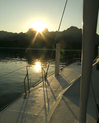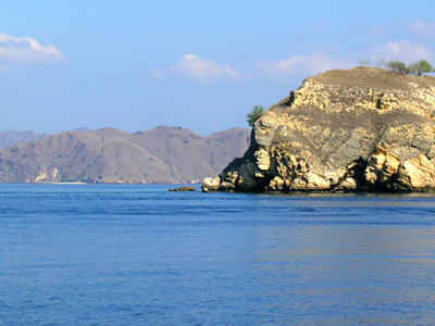 Gunter is up. The teapot is whistling…demanding. I'd put off brewing the coffee, wanting to keep Pacific Bliss quiet for as long as I could. After half an hour, the shoreline is distinct, but still the sun has not appeared. That's good, because the only clouds in the sky have rolled over toward the park ranger station. It will be blazing hot in this still, moist air as we motor on to Rinca.