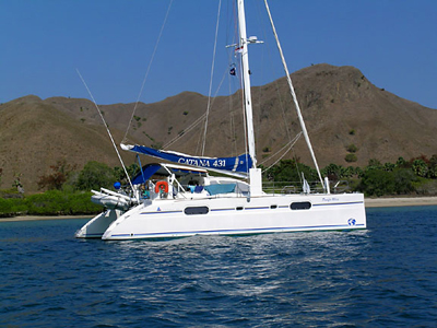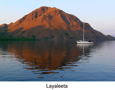 The coordinates of two anchorages selected from the Southeast Asia Cruising Guide are off, and don't allow for the swing room we need. Layaleeta and Rainbow Voyager are having a similar problem. Finally, after repeated anchoring, we three are settled in. They tuck into a cozy inlet, facing a sandy beach. Pacific Bliss drops anchor at 34' right in the center of an inlet, towards the end. Perfect places don't come easy! It has been a short trip (18 miles from Komodo) but with tricky navigation and difficult anchoring. Alison and I cook the food for our two-day passage to Lombok: boiled eggs, potatoes and yams to make a salad along the way; and pasta—with a jar of sausage-and-mushrooms tomato sauce from our Darwin provisioning. Then we jump into the water to cool off. We have invited both young families to a happy hour, so there is only one hour for our pensioner's nap. Our guests arrive at 1700. Layaleeta contributes an Australian champagne : sparkling chardonnay/shiraz, which the women enjoy (except for Nicole, who brings her own Indonesian Bintang). Gunter introduces Eric to Queensland 's Dark & Stormy . How he has escaped this canned cocktail so far is a mystery! He asks for a second. Another American bites the dust. The children—Ryan, Brian and Luna—have juice cocktails. There are two bowls of popcorn as well as all kinds of munchies. The two families toured Pacific Bliss. “I'm hooked,” says Susan. “A catamaran was my dream boat anyway, good for a family of four. Now I can buy yours in three years. Lots of buyers lie in wait.” It appears that Pacific Bliss might have a good future after the Hofmann's! She is not the first one to desire Pacific Bliss when the circumnavigation is complete. Reflections on Rinca, Wednesday, 0700