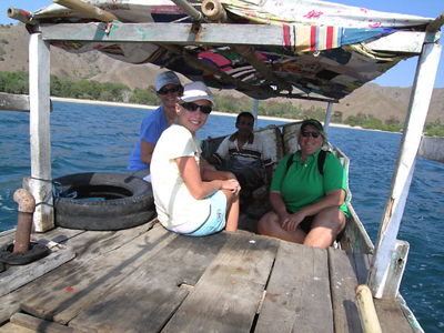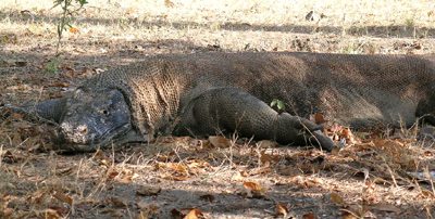 (In retrospect, we might have felt differently, had we seen the prey we'd come for. But all we saw was the rather lazy dragon by the ranger station (obviously kept and fed by them there). Although we hiked as a group, following a guide to the pit where—in former years—they brought a goat to be attacked by the dragons, we never saw another dragon. When Gunter and I had visited Komodo in 1995, we'd seen quite a few skinny dragons lounging around the pit area. I even took a photo of one ambling toward me! A year after the rangers had cut off the practice of sacrificing the goats, the dragons were still lounging around, refusing to go out and hunt. But by the time we came this second time, the dragons had dispersed and had acclimated into the wild. It is an interesting conundrum. The tourists had been the ones who complained to the Indonesian government about the bloody practice, in force up until 1994. Now, the tourists are complaining that they come all this way to see dragons, and they can't find any. Of course not! The dragons had finally been forced to hunt wild boar and deer, so they are hiding in the jungle.)