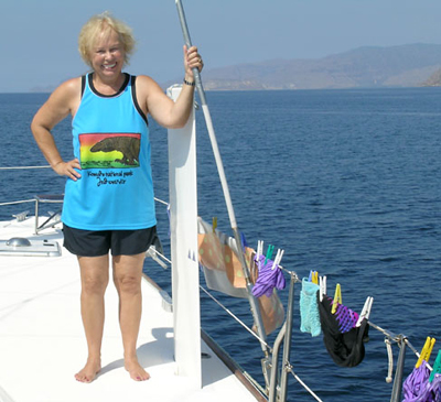 As I write this, Pacific Bliss is sailing along at 6-7 knots, on a beam-to-broad reach, with the wind at 13-15 knots. Perfection. You cannot imagine how wonderful this breeze feels! I realize that I am sitting at the helm without my hat and rush to put it on.