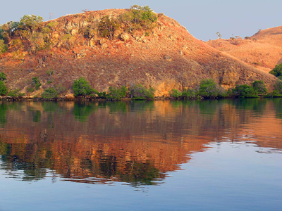 Gunter and I sit together on the helm seat as Pacific Bliss floats on the calm inlet, hugged by mountains on three sides, reflecting into the sea. Our entire world consists of Pacific Bliss, blanketed by the island of Rinca . We are folded into her arid slopes. We are comforted by her baby blue skies and soft green seas. Here, there are no birds chirping, no roosters crowing. We squint into the binoculars to find any sign of life. Dragons? No, the shoreline is steep, the mountains arid. This is not the environment for dragons. They like to crawl along dry river beds, like the one we traversed during our Komodo hike.