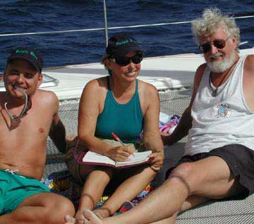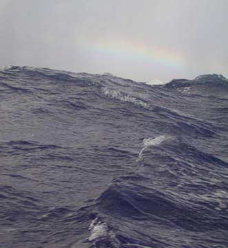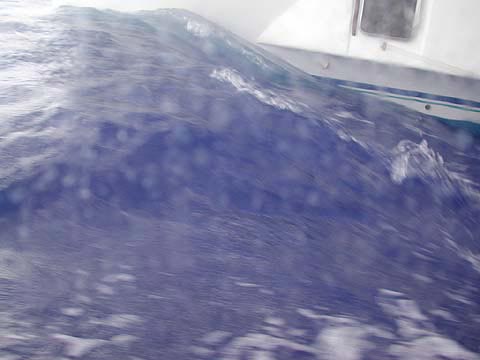 Last night, on a watch after the sun had set and before the half moon rose like a white sugar bowl behind our stern, Pacific Bliss had quite a wild ride in store for me. Seated at the starboard helm, I began the watch marveling at the flickering phosphorescence jumping from the waters surging past the two aft hulls. “There is so much life in the sea that I know nothing about,” I thought. “I need to find a book about this.” Pacific Bliss interrupted my reverie with her constant surging, as if the wind could not push her fast enough. 9 knots-no, 10 knots-then 12 knots-how about 14-16 knots? We were racing through the night! When the wind gusted to Force 7, I woke up Gottfried, considering reining her in by taking down her spinnaker, but oh I hated to do that, the ride was so exhilarating. A rain shower came and went, and then another. But these were not squalls, so we decided to let her race on. With my light foul weather gear, wearing shorts and bare foot, I kept an eye on the spinnaker and let Pacific Bliss run and run through the night, her sleeping passengers bouncing on their foam mattresses. The day brought a series of showers and squalls, as if Poseidon needed to teach us a few lessons before we raced out of his grasp. We had experienced such a charmed crossing up until now: only two rain showers-less than ten minutes each-and no squalls or thunderstorms.