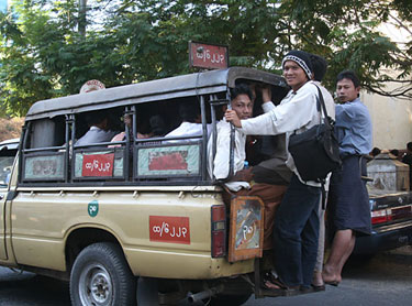 driver points out a typical Burmese bus. They are invariably full to the brim,