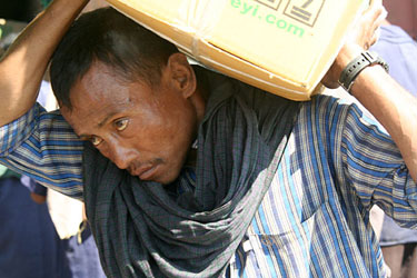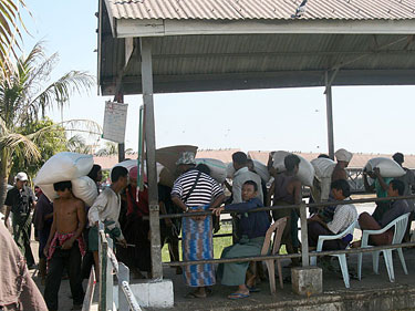 carry bags of rice on their backs. They deposit their load into waiting trucks,