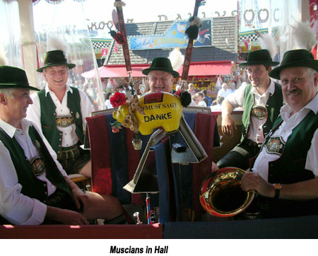 huge steins of beer, singing, platters of sausages, men dressed in Lederhosen