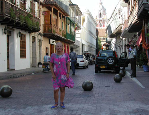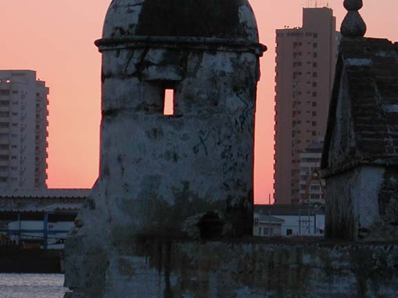 We are also very relieved to be here. The night before we arrived was very long, with all hands on deck. No one slept before morning. We encountered a force 9 storm, gusting to force 10, off the coast of Barranquilla. Now we’ve “been there, done that” and NEVER want to see these kind of seas again! Fortunately, Pacific Bliss and her passengers arrived exhausted, but sustained no damage or injuries. The windows leaked through the rubber on the starboard side as Pacific Bliss saw waves crashing into the side, above the dagger boards. Following seas rose higher than our dinghy, but fortunately never broke into it. We ran with the wind, staying 60 miles off the Columbian shore, giving ourselves plenty of sea room. “Ray” tells us that we reached a new maximum speed for Pacific Bliss, 25.8 knots! That’s with a triple-reefed main. More details on our night of sheer terror to come in future postings. We are safe, well, recovering here and seeing the sights, and will most likely have our zarpa and be ready to leave at dawn Monday morning. We plan to anchor in a small Colombian port overnight. Then we have a passage across a supposedly calm bay to the San Blas islands, where we will spend a few days prior to our transit through the Panama Canal. More Photos from Cartagena, Colombia.