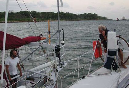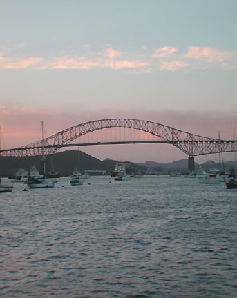 Sitting in the cockpit of Pacific Bliss as the sun began to lower over the mountains near the Bridge of the Americas, Phyllis, Richard, Gunter and I finally breathed a deep sigh of relief. Then came a cheer and a toast. We did it! It has been one very long, sometimes tense, always exhilarating, day. In a little over twelve hours and 50 miles, we have traveled to the other side of the “Big Ditch” into a very different ocean. The winds and seas seem calmer here, and the tropical air seems fresher and cooler, or is it just my imagination? I feel GREAT! And as for Pacific Bliss, she is rocking and rolling less in this calmer anchorage. She deserves a rest—and a good cleaning with fresh water, inside and out. I know that she will delight in this ocean and provide her owners with many moments of bliss, because this is her namesake, Pacific Bliss.