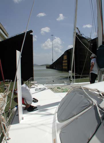 Jose quickly took charge, saying that Pacific Bliss would be the “lead” boat, and—as such—control all of the operations, including line handling and engine. He was obviously into control, big time! The two monohulls were now behind us, but coming up quickly. Jose’s plan called for Pacific Bliss to enter the locks against the wall, pulling along the rafted Iwalani. Then as the French boat came up, she would move into place between Pacific Bliss and the wall. He wanted us into the locks quickly before a freighter that would transit with us arrived. This procedure was not as smooth as the one we had undertaken transiting the Gatun locks. First, with only Pacific Bliss using its engines, there was less maneuverability. We had to pull in, then away from the sidewall to fit in the other boat. Our first Pilot had directed all three boat captains, and the entire nesting operation, saying not only what to do, but how to do it. Jose, however, gave vague direction and spent most of his time on his cell phone, acting important. Soon it became evident that controlling the lines from the center did not work. Our line handlers were then loaned to the other boats. Eventually, we were in position and began to move forward to the front of the locks. As the three nested yachts moved ahead, a forward line from Iwalani, on our port, caught in the walls of the locks, turning the entire raft toward port for one long, tense moment. Only quick use of Iwalani’s fat fender prevented damage to their boat. Our line handler pulled the stuck line loose, Gunter gunned the motors, and we were position again. The giant freighter came into behind us; the gates closed; and the locks began to empty. We dropped 31 feet before the gates re-opened. Since we were all tightly nested, the captains asked Jose to allow us to move on as a raft the one mile across Miraflores Lake to the Miraflores locks. Jose agreed, then ordered Gunter to push Pacific Bliss, both motors, “full speed ahead.” “Hard on the boat,” Gunter mumbled to me, but proceeded as instructed.