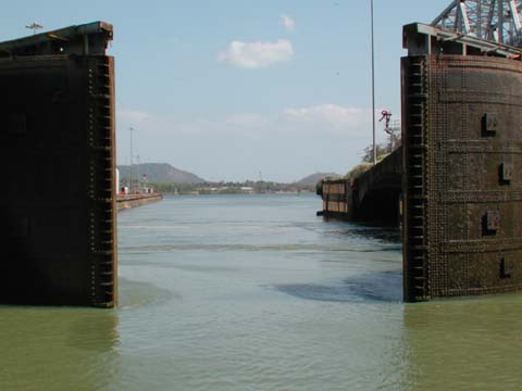 Miraflores Locks. These locks consist of four chambers in two lanes of two chambers each side by side, just like the Pedro Miguel locks, except that the transit involves going down in two steps. As the gates open from the last chamber, the water level inside and outside is the same, but the heavier saltwater outside of the gates sinks down under the fresh water and into the chamber and the fresh water on top surges out. The tongue of the current can be seen flowing out of the lock. Of course, upon exiting, we were given the “full speed ahead” command to overcome the current, but then, what else is new? Safely out of the locks, we unrafted again.