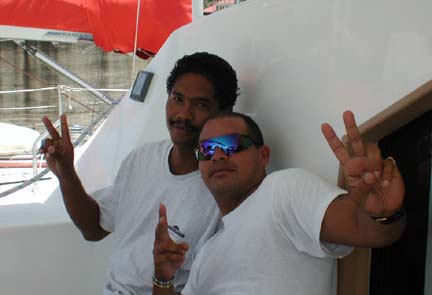 I went inside to check the chart for the location of the Bridge of the Americas and our exit from the channel at buoy 15 ½ to the Balboa Yacht Club. As I came out, we had rounded the bend, and there it was. The bridge spanned the Isthmus of Panama in grand style. Built in 1960 at a cost of $20 million, it is an integral part of the Pan American highway. We motored to the club’s floating dock, where we took on water and fuel, and were assigned a mooring. Our Panamanian line handlers departed, after being given a cold beer, and Tula, another Panamanian, helped us secure our mooring, the first of many times he helped us out at the Balboa Yacht Club.