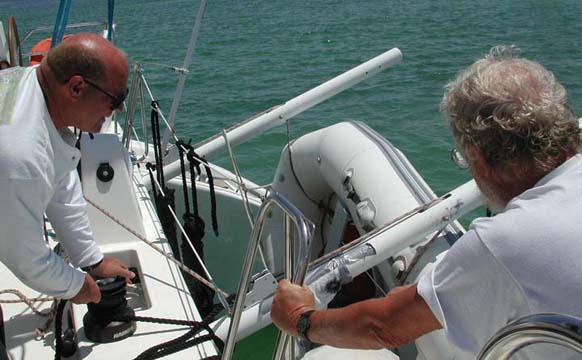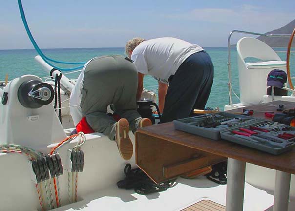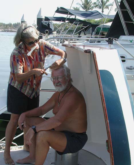 There is a thing that comes over men when they give up the corporate life to become cruisers: it's called messing with boats. If it works, it is a good thing. If it doesn't, it could signal the end of a couple's cruising life. Men need to mess with boats because boats break-a lot. And if they don't learn to fix them, and to enjoy the process, they will be frustrated in paradise, with no place to go, and-usually, no-one to come to their rescue. Over a year ago--in July 2000--Gunter wrote Messing with Boats, Part I; he didn't realize at the time how prophetic his desire to "mess with boats" would become. I wrote the beginning of Part II when we were docked at Paradise Village Marina in Nuevo Vallarta, but never did get around to posting it. Now that the fixing discussed in Messing with Boats, Part III has become very necessary to get Pacific Bliss the rest of way around the world, I think it's time to fill in the gaps. We had arrived in Nuevo Vallarta after a hair-raising night beating against the wind and the waves rounding Cabo Corriente. We had been up all night, Pacific Bliss bucking like a bronco and Gunter and I each taking turns on watch, while the other stretched out in the salon. Sleep had been impossible until we arrived in the calmer Banderas Bay that morning. But by the time we called the marina and were directed to a slip, we were dog tired. We were lucky enough to arrive on a Wednesday, however, and that was the night of the Weekly Cruisers' Potluck held at the end of the docks at Paradise Village. We were invited as soon as the lines were cleated, so there would be no sleeping for us. At the party, it became apparent that the guys were deep into messing with boats and the women were heavy into shopping. Three of the cruising couples who were there for the season had gone together on a used car. For the first time since we had sailed away from the south of France, I could get around on land without using taxis and buses. Life was great. I became soft and spoiled. After a couple of days, I tried to woo Gunter into the land life to get a much-needed haircut, but he was too busy messing with boats and negotiating for new treasures. (A key part of the morning VHF cruiser's net there was called "Treasures of the Bilge.") His latest find was a cruiser who was willing to sell his dinghy wheels. (We had not-so-fond memories of struggling to pull our dinghy high up on the sand at low tide in El Coco, Costa Rica while two couples half our ages--obviously landlubbers--sat idly on the retainer wall, watching us huff and puff.) Hitching a ride in the "cruiser car," I left to get the lumber the very next day so that Gunter and Jimmy could build an apparatus to attach them to our deprived, wheel-less dinghy, Petit Bliss. I returned to the docks, lugging the boards, to find Gunter happily seated on an overturned soup pot, shaded by one-half of a wooden dinghy turned upright, while Judy, co-owner of Quest, was busy giving him a haircut! Gunter gets a haircut on the cruiser docks. "Messing with boats" took on a more serious tone in Magdalena Bay during the Baja Bash. We had rounded yet another windy cape, Cabo Falso, on our voyage from Cabo San Lucas to San Diego. At the perfectly appropriate moment, right as the wind god reached the peak of his fury, tossing angry seas hard against the rocks at our lee in ink-black darkness, the dinghy line broke. The dinghy hung there vertically, motor and all, at a 90º angle to the sea. I could envision the other line breaking and Pacific Bliss racing toward the dangerous rocks to rescue a rapidly escaping dinghy. But, on the recommendation of David, our broker, Gunter had installed a backup line that held the dinghy in place, all the way to Mag Bay. Here you see our Baja Bash crew, Bix, and our esteemed Captain Gunter, butts in the air and tools on the table, surveying the situation they will attempt to fix. And here you see them formulating a plan to mess with our dinghy as it limply hangs there. Butts and Tools. Back safely in San Diego and deep into the warranty repair list, "messing with boats" took on a new significance. That is when I first accused Gunter of having a mistress. Evidently, not content with our home on beautiful Mission Bay, at the heart of "America's Playground," he paid her a visit almost every day. Knowing that his mistress was Miss Bliss, I couldn't get too concerned. Actually, I love her too. We explored that subject at a dinner party we held one night, in which six out of eight were cruisers. The non-cruisers asked why a boat is always a "she." One couple has a Silicon Valley engineering background. "What do you mean?" one asked the woman. "A boat is a neutral object. It is neither a he nor a she." "It's a big piece of fiberglass, with gleaming teak, and wonderful electronics, and can be beautifully designed, but it is definitely an It," her husband added, warming to the subject. "A boat is indeed beautiful; it has nice lines and curves and warmth. It is a she," one cruiser added. "Each boat has her own personality, her own feeling; she puts up with a lot, and takes care of people. A boat is a she," confirmed his wife. "What do you think, Lois?" "I think that a boat is a she," I responded. "When you go into her cabin, she envelops you like a baby in the womb. She comforts you. Once you get to know her, you develop a trust in her and begin to talk to her like a person." "And the two bows of Pacific Bliss are like breasts," said Gunter, concluding the conversation. Her sides are smooth and sleek, yet rounded. She's simply beautiful." It was then that I knew that "Messing with Boats" was more