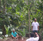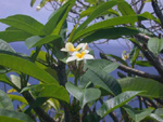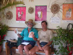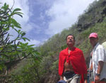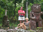 Monday, our first full day at anchor after twenty-one days at sea, was mostly spent recuperating. The high point was finally linking up with our buddy boat, Makoko, and our friends Jean-Claude and Claudie. We had planned to meet them at a designated waypoint in the vast Pacific. Makoko would sail west from Cabo San Lucas and Pacific Bliss, south from San Diego. The winds didn't cooperate, so we had kept in touch via SSB, on our private Vin Rouge Net, twice each day. Having arrived in Hiva Oa first, Makoko already knew the ropes. Jean-Claude helped Gunter through the check-in process at the gendarmerie in the nearest town, called Atuona. Then we all went to the bank to get CPFs (they still have the Central Pacific francs as exchange, even though the Europeans have adopted the Euro). Jean-Claude then lined up an island tour for the next day. : Gunter and Jean-Claude at the bank in Atuona From there, we went to the only restaurant in town that was open, a big billboard saying SNACK, across the front, menu on a chalkboard, and self-service ordering, but great food. I ordered ginger chicken with rice. At 0830 Tuesday morning, all six of us were waiting at the concrete jetty, having secured our dinghies for the day. A red Toyota truck arrived with room for only three of us inside. Gunter sat up front next to our driver/guide, Sabine; Claudie and I sat in the backseat, while Jean-Claude, Armin and Doug climbed up into the back of the truck. That arrangement was just fine until the truck climbed up and up into the mountainous rain forest. The rain pounded down and the three in back began to take on the appearance of drowned rats. Ironman sat there, stoically, a small hint of a smile cracking his face; he was happy that this was a tropical rain, a far cry from the snows of his native Germany! Doug still had his big smile, treating this as just another adventure. But Jean-Claude looked miserable. His red knit polo was absorbing water big time. When we stopped at an orchard at the top of the mountain, he went to the back of the fruit storage shack, stripped it off, and tied Claudie's red scarf around his shoulders as a shawl. : Jean-Claude at the fruit shack We made our selections of fruit: a large bunch of green bananas, two packages of dried bananas, papayas, limes, and pamplemousse to be picked up on our way back. There is only one road to the Tiki Village; which is constantly under construction. It starts out as blacktop and ends up as gravel, a four-wheel-drive-only material. At one point, we stopped to move a large boulder out of the way. Photo 5628: The guys move a boulder off the road-their good deed for the day. The drive was a little hair-raising as the Toyota veered around the steep cliffs on one side, the sea far below, but the view was spectacular. The deep blue bays were serene and pristine. We did not see one vessel in any of them, until we reached the village. "Why not?" we asked Sabine. "It is not as calm as it looks down there," she said. "The shores are rocky and the high surf makes it all but impossible to get to shore anyway." : View of pristine bay. (coming soon) After the orchard stop, a Land Rover driven by Pepe, Sabine's husband, arrived and the two tour groups traveled together, stopping at various photo ops. In the other group were the captain and crew of Raven, a familiar name from the Puddle Jump Net. Pepe, a large, stocky Marquesan, told stories at each stop. He also taught us the Marquesan war chant, which we practiced periodically, feet apart and knees bent slightly, for a low center of gravity. We pulled our arms down fiercely in an Uh, Ooh chant, a comical sight in the rain, I'm sure. Both vehicles were stopped at a turn in the gravel road, tall rocky spires to our backs, steep cliffs leading down to an especially deep bay below. Pepe made it a point to explain to the assembled group that the true Bay of Virgins is right here-not in Fatu Hiva, to the south, an island we planned to visit. "In Fatu Hiva," he went on to say, "the missionaries changed the original spelling Bay des Verges-which means Bay of the Phalli to Bay des Vierges, which actually makes it worse, because now it means 'virgins on the rocks.' " "But right here," he pointed to a high table-like formation, "is a rock where virgins were actually sacrificed, and this bay below you is where they were thrown." Living up to my name, "Digital Lois," I walked around taking photos as Pepe talked. So I missed a few of the stories. Cannibalism was a prime topic. "The last cannibalistic ritual was performed in right in Hiva Oa, at Atuona," Pepe said. He seemed proud of his fierce ancestors. When the Marquesan girls go on to school in Papeete, he told us, they do not speak the Marquesan language; they speak only French, because they are reluctant to admit where they are from. But the boys are proud of their warrior heritage and call the native Tahitians the French equivalent of "wussies." When two tribes would fight, and upon the defeat of one, the winner would have the head of the vanquished foe cooked, then brought back to him. Then, in front of the foe's followers, he would first eat the lips (a sign of authority), then the eyes (to demonstrate vision) and lastly he would slowly open the skull and proceed to eat part of the brain. At that point he would take on the mental attributes of his enemy. This ceremony allowed the vanquished warriors to serve him as their king and they now followed him willingly. Back in the touring car, Sabine continued a lively conversation in French and English that she had learned by attending college in Fiji. Her twelve-year-old son sometimes accompanies them on tours and can repeat the stories his father tells. It's great to see that in at least one family, the traditional stories are passed on. Most modern day Marquesans, Sabine explained, are not interested in their history and legends. "How long have you been married?" Gunter asked. "Twenty years." "To the same man?" "Yes," she